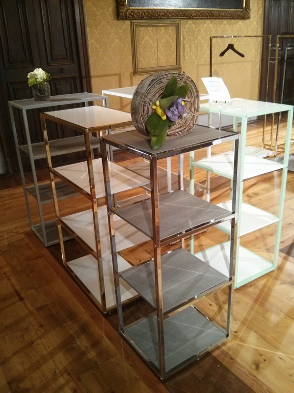 Espositore da terra a n.4 ripiani (venduti separatamente, art. 2509 misura 400x350 mm), con perni reggi-piano per legno o vetro. Può essere montato su ruote (art. 9695).