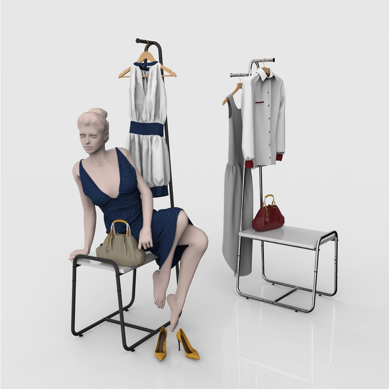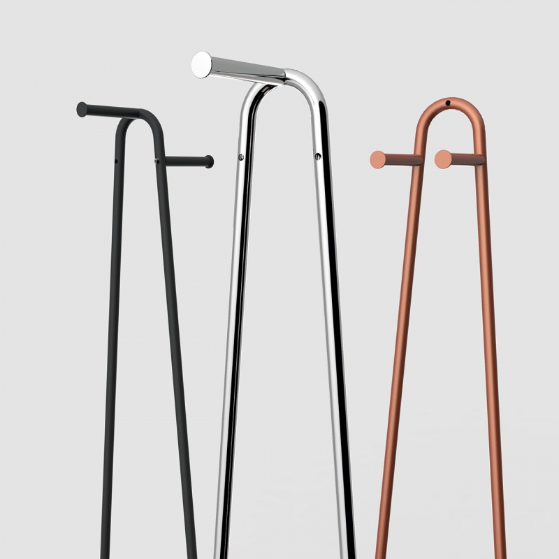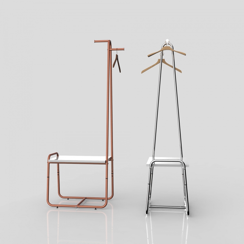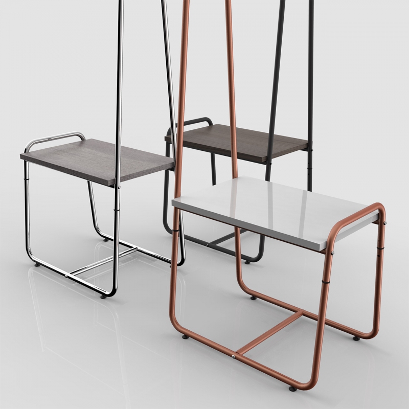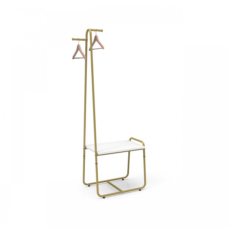 Realizzata in tubo tondo Ø22 mm, è fornita con due braccetti appendiabiti; piano in legno ad altezza seduta (art. 2560 venduto a parte).