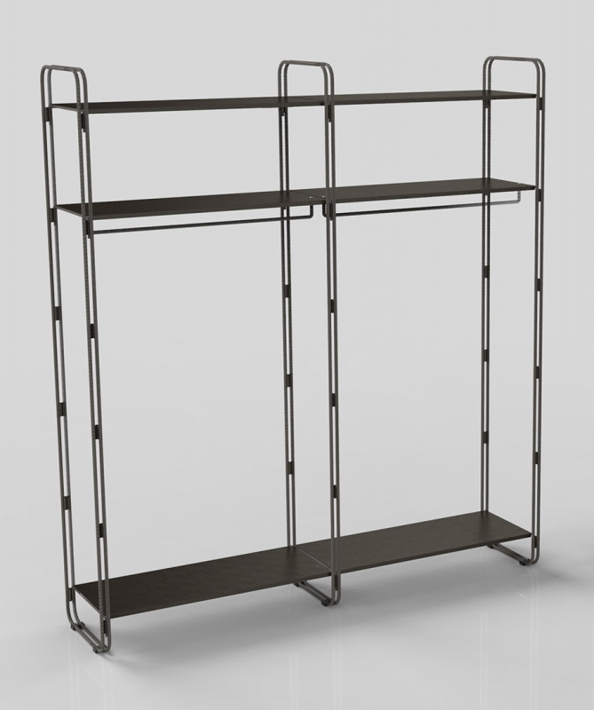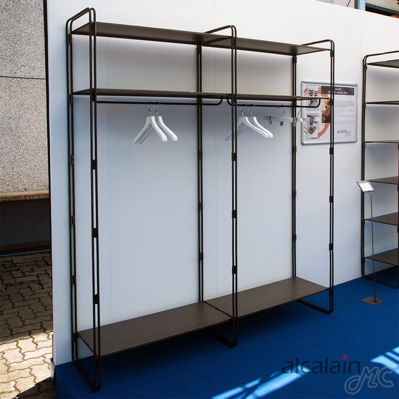 Realizzato in tondino edile, soluzione estensione da assemblare con altre unità, fornita completa con 3 ripiani in lamiera a incastro e 1 barra appenderia. La struttura è da fissare a parete. (Singoli articoli che lo compongono: 1 x 7130, 3 x 7150, 1 x 7153)