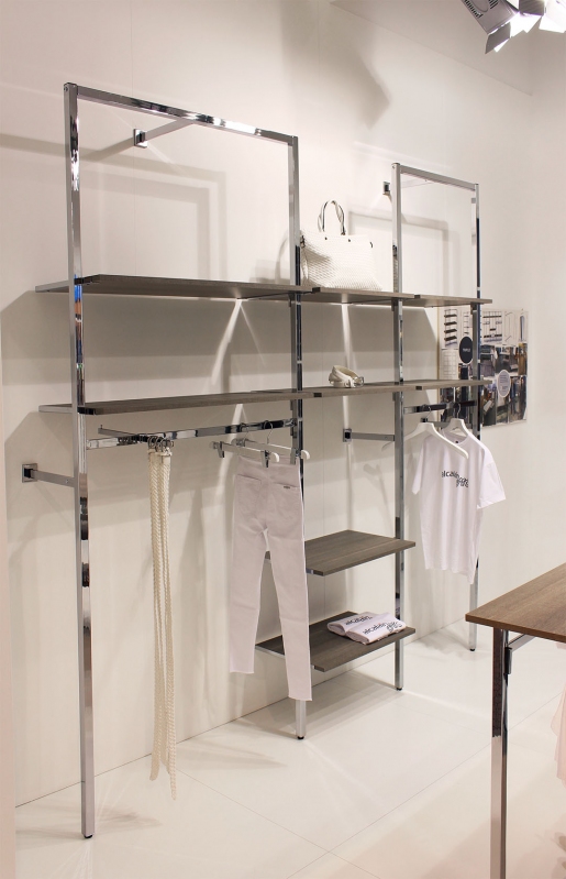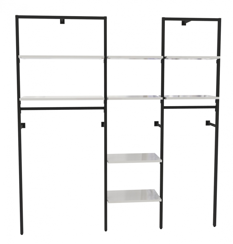 Montanti cavettati passo 50 mm, completo di n.3 attacchi a muro e mascherine copri piastra. Realizzata in tubo quadro 30x30 mm, fornita smontata completa di ferramenta. Barre appenderia e mensole a parte (art. 9353B, 9343dx/sx).