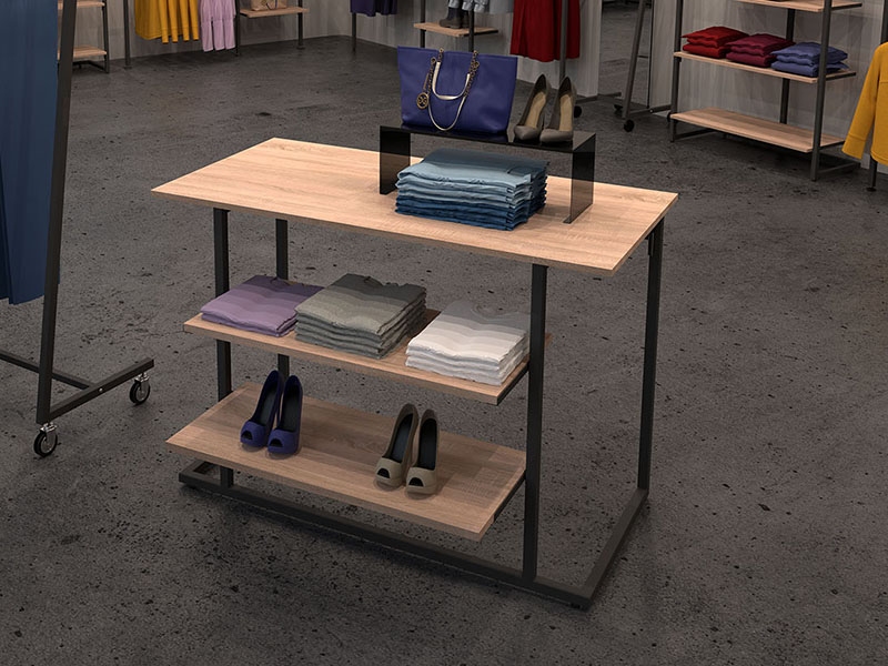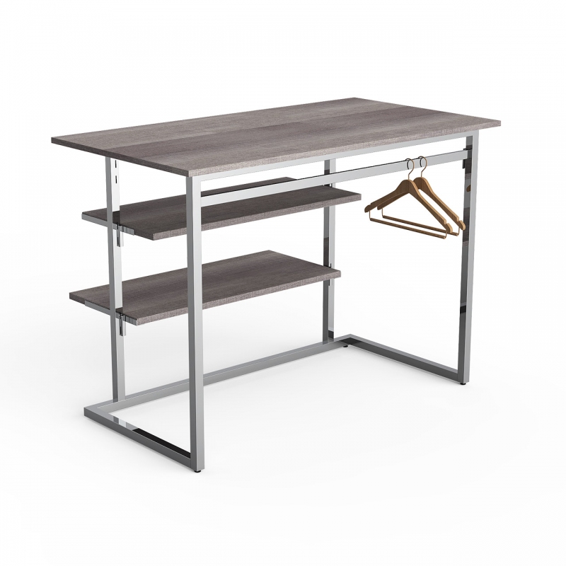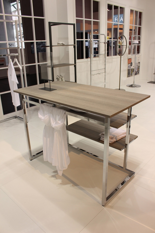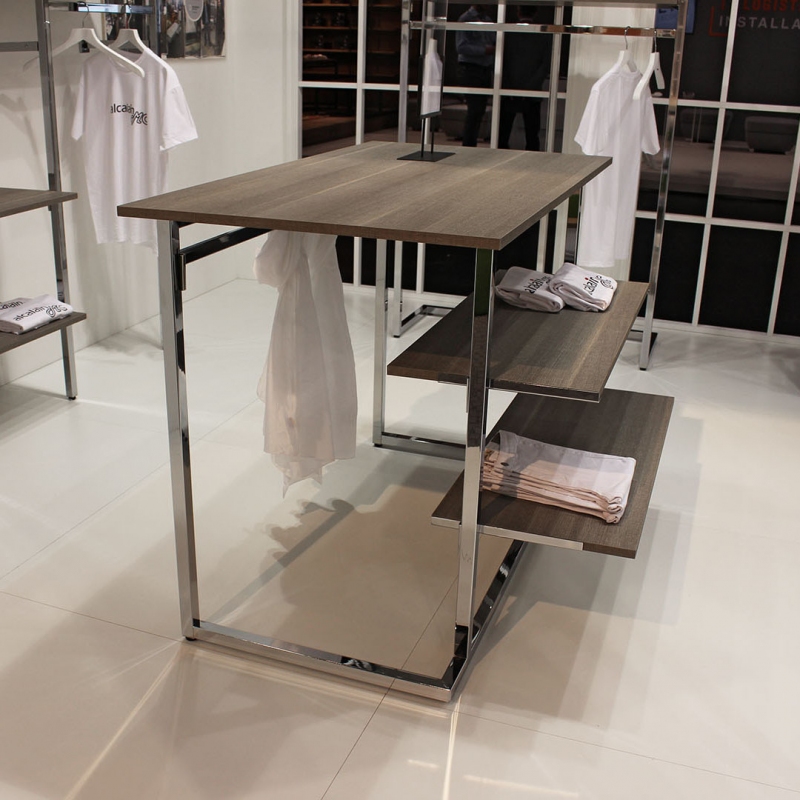 Struttura tavolo grande attrezzato con una barra appenderia e due coppie mensole per ripiani (art. 9353D e 9383DX/SX), fornito smontato completo di ferramenta. Top e ripiani in legno a parte (art. 9380L e 2500).