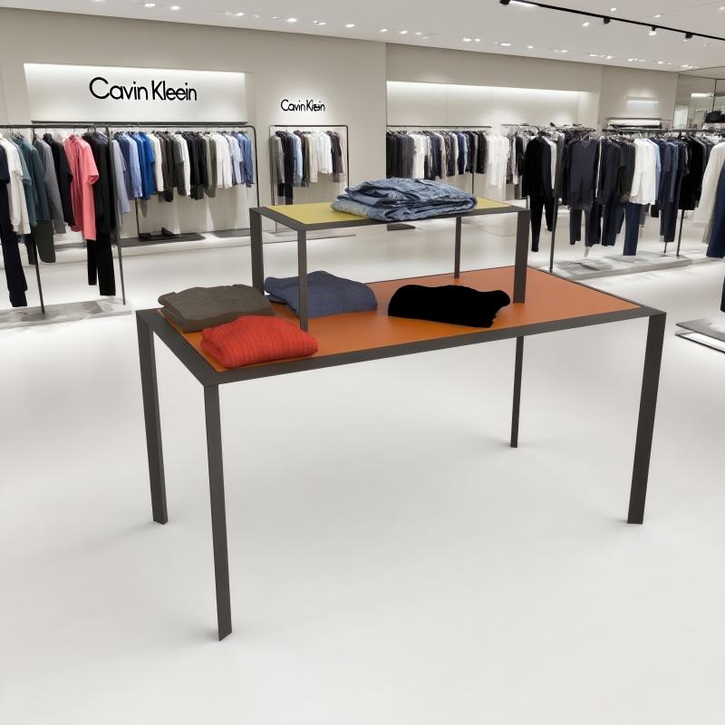 Espositore da banco in tubo triangolare con ripiano in lamiera