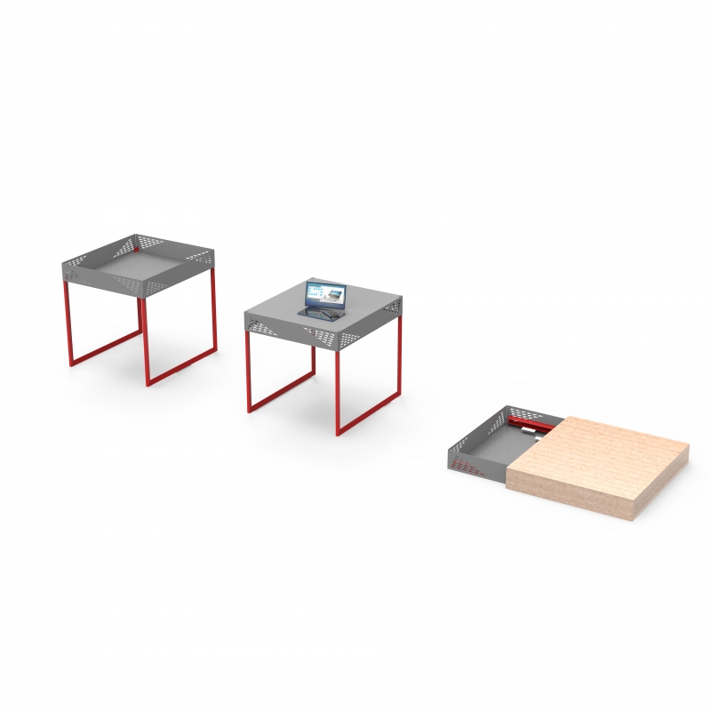 Cesta piccola in lamiera con gambe smontabili in tubo triangolare . Il contenitore in lamiera può essere montato capovolto per diventare un tavolo. La cesta può essere inserita nel modello più grande per ridurre l’ingombro durante il trasporto
