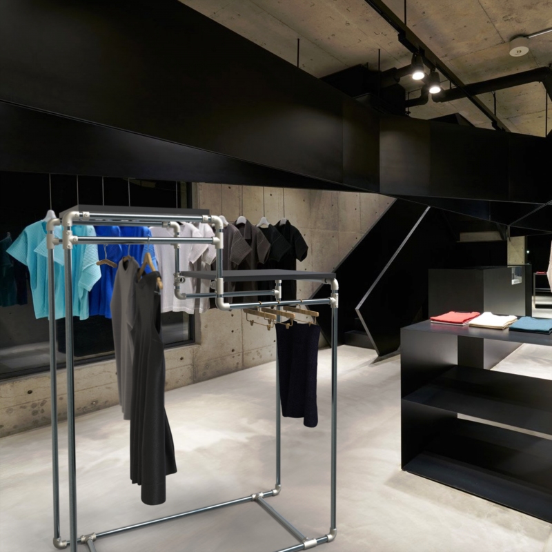 Gondola con ripiani ed appenderie a 2 altezze realizzato con tubi e giunti Idroshop Ø28. Provvista di ripiani su entrambe le testate. Viene fornita la struttura in metallo completamente smontata, senza ripiani in legno.