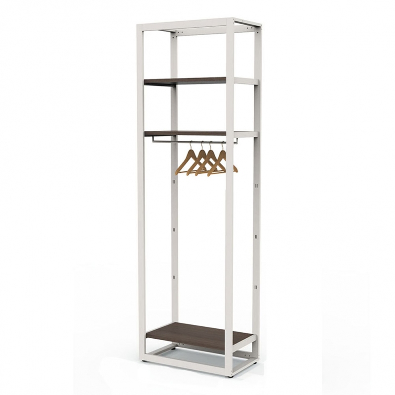 In tubo 50x20 mm, con 1 barra appenderia e 3 coppie mensole (ripiani art.2560 esclusi); kit fornito smontato completo della ferramenta per montaggio.