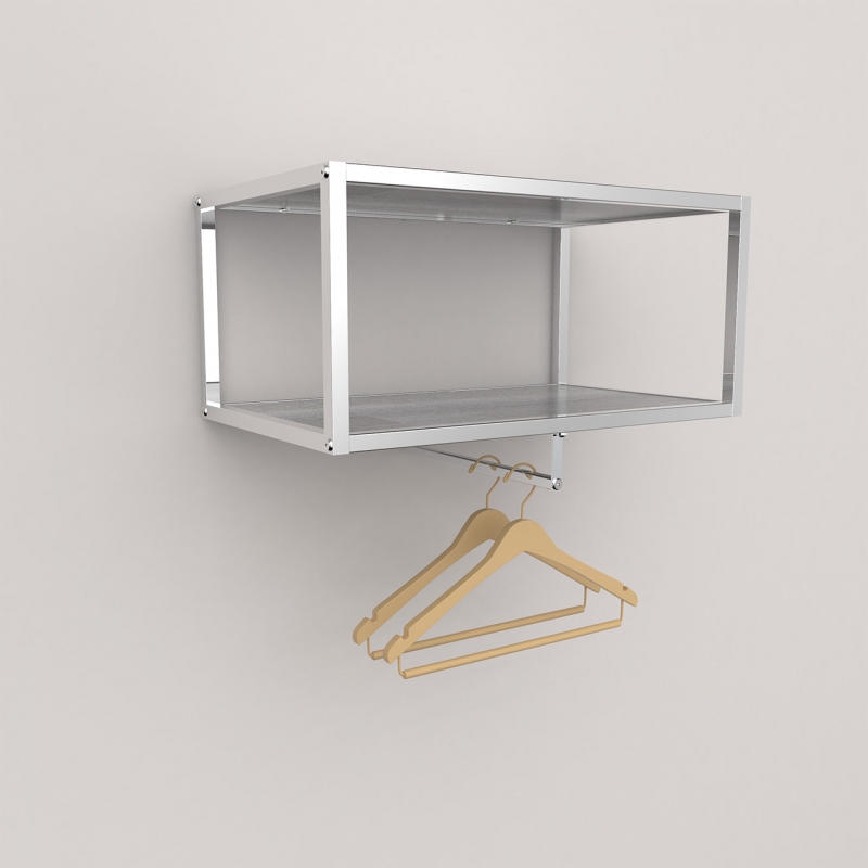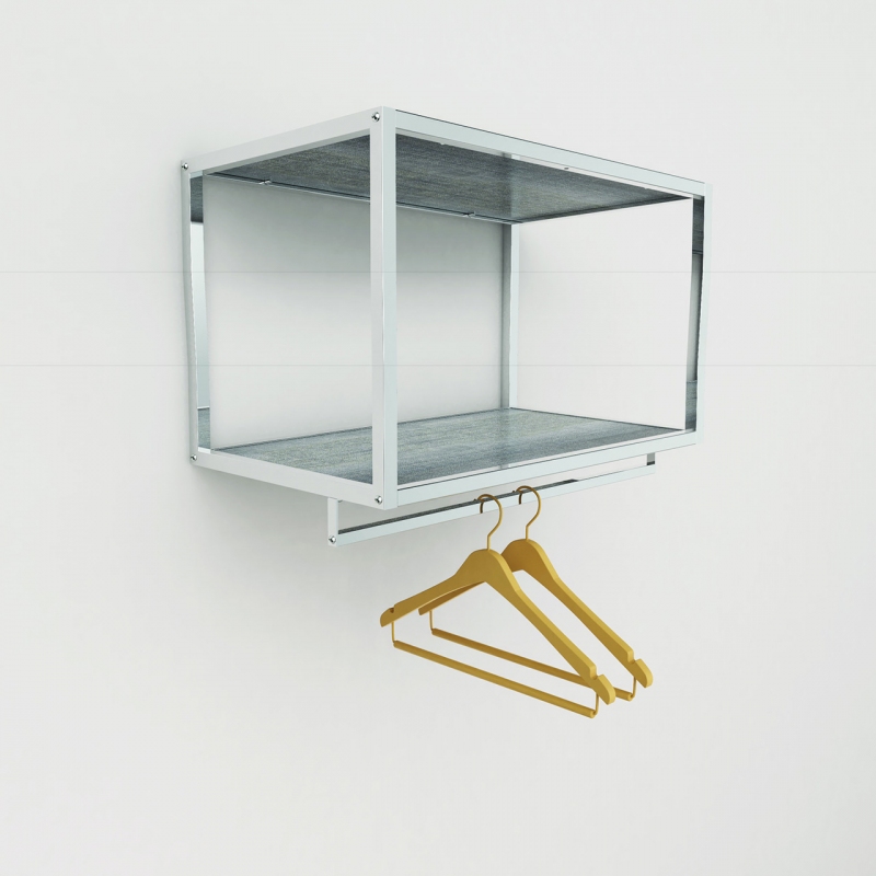 Con perni reggi-piano per n.2 ripiani legno o vetro (venduti separatamente, art. 2506 misura 600x350 mm). Le barre appenderia possono essere montate sotto ai ripiani (art. 9690B o 9690D).