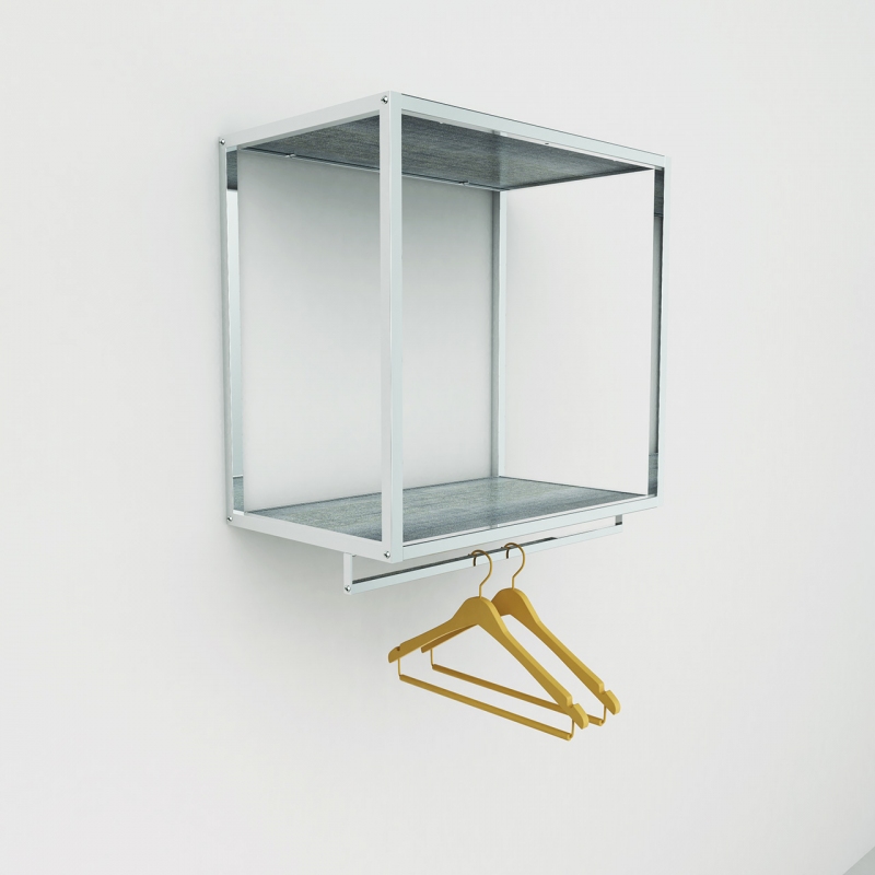 Con perni reggi-piano per n.2 ripiani legno o vetro (venduti separatamente, art. 2507 misura 900x350 mm). Le barre appenderia possono essere montate sotto ai ripiani (art. 9690C o 9690D).