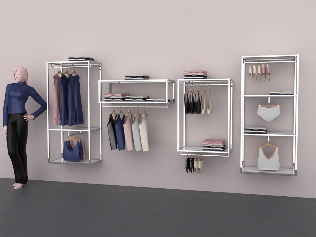 Con perni reggi-piano per n.2, 3 o 4 ripiani in legno o vetro (venduti separatamente, art. 2506 misura 600x350 mm). Le barre appenderia possono essere montate sotto ai ripiani (art. 9690B o 9690D).