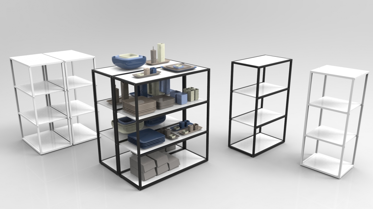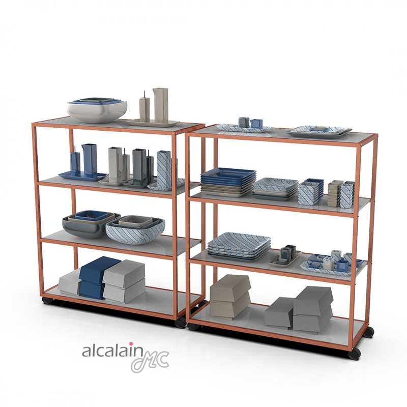 Espositore da terra a n.4 ripiani (venduti separatamente, art. 2507 misura 900x350 mm), con perni reggi-piano per legno o vetro. Può essere montato su ruote (art. 9695).