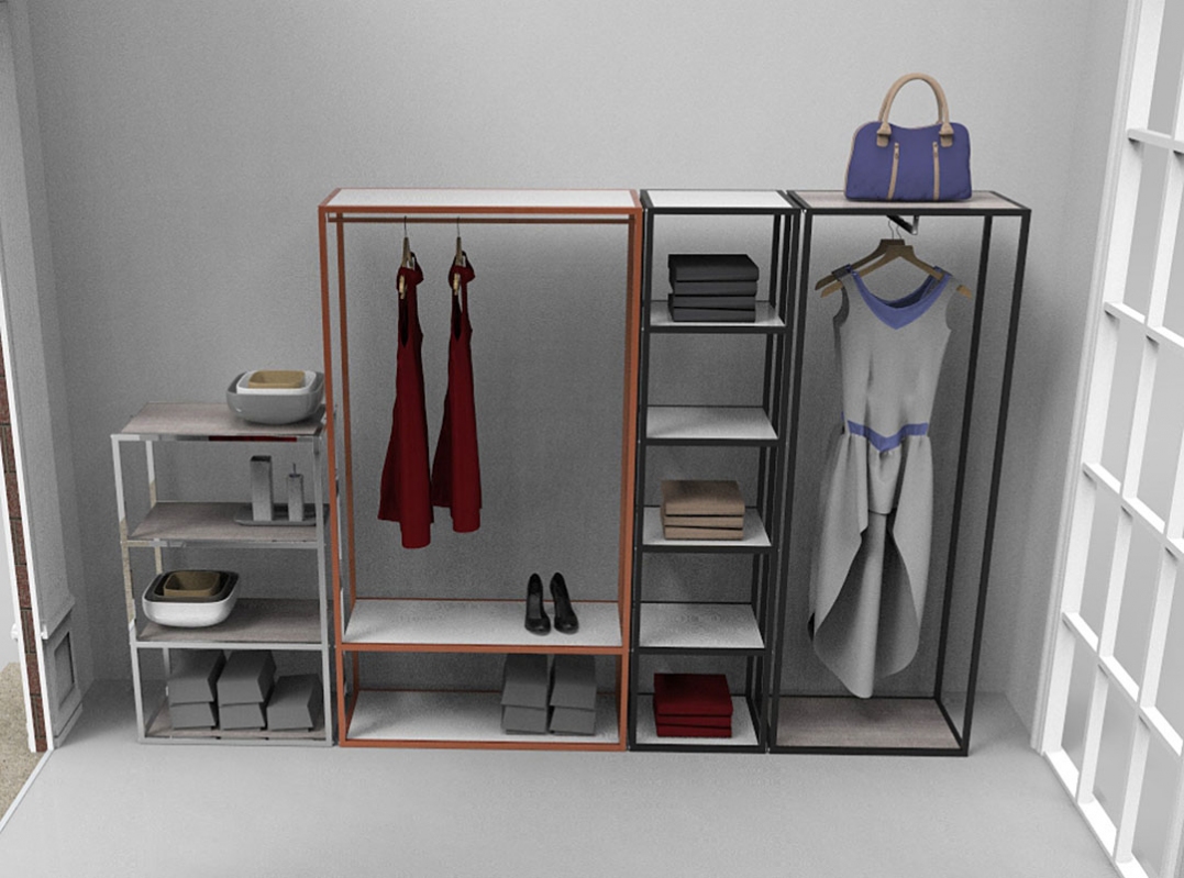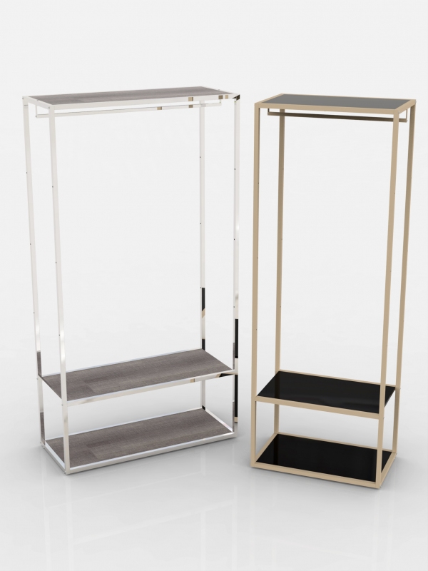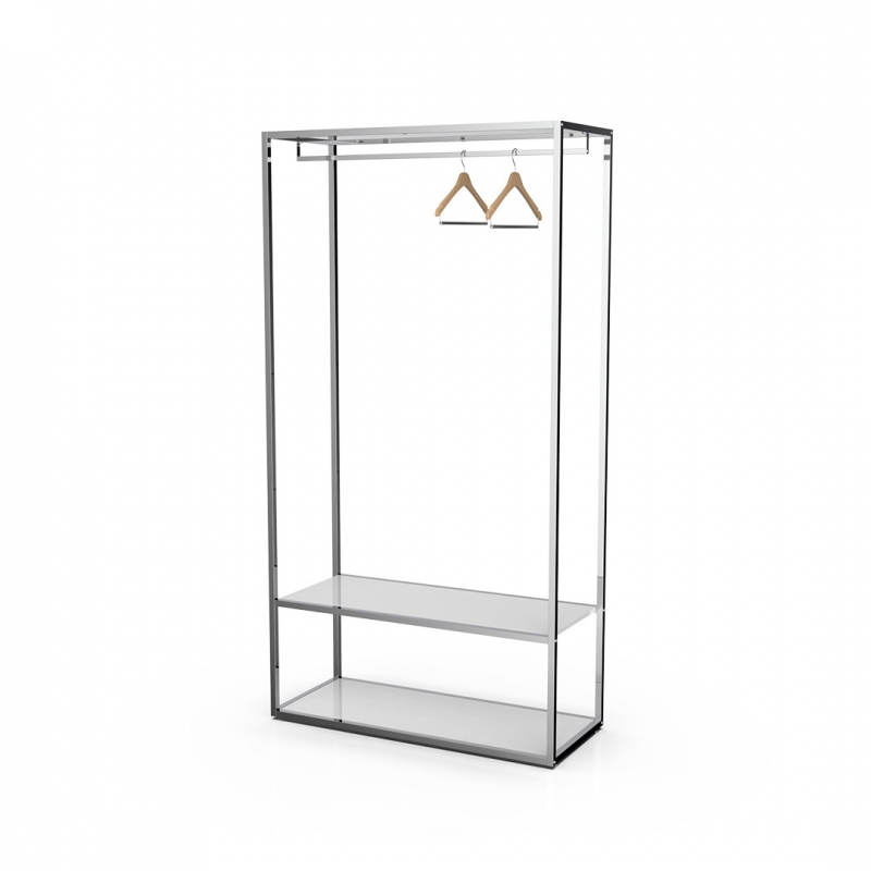 Espositore da terra a n.3 ripiani (venduti separatamente, art. 2507 misura 900x350 mm), con perni reggi-piano per legno o vetro. Le barre appenderia possono essere montate sotto ai ripiani (art. 9690C o 9690D).
