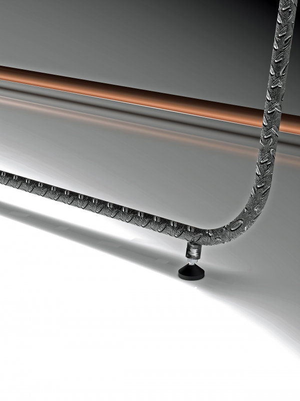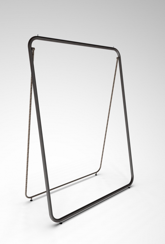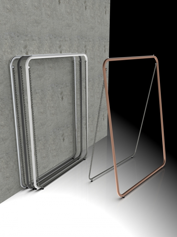 La struttura è composta da una telaio sostenuto da una stampella a “U†in tondino edile che può essere richiusa, garantendo uno spessore minimo. Finitura cromata o verniciata nei colori a campionario. Sulla barra superiore c’è una piattina cromata per evitare che la vernice sia rovinata dalle grucce.