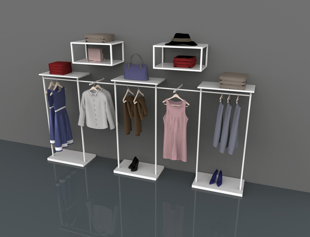 Soluzione modulare a muro a cinque campate con barre appenderia, completa di basi e ripiani in legno.