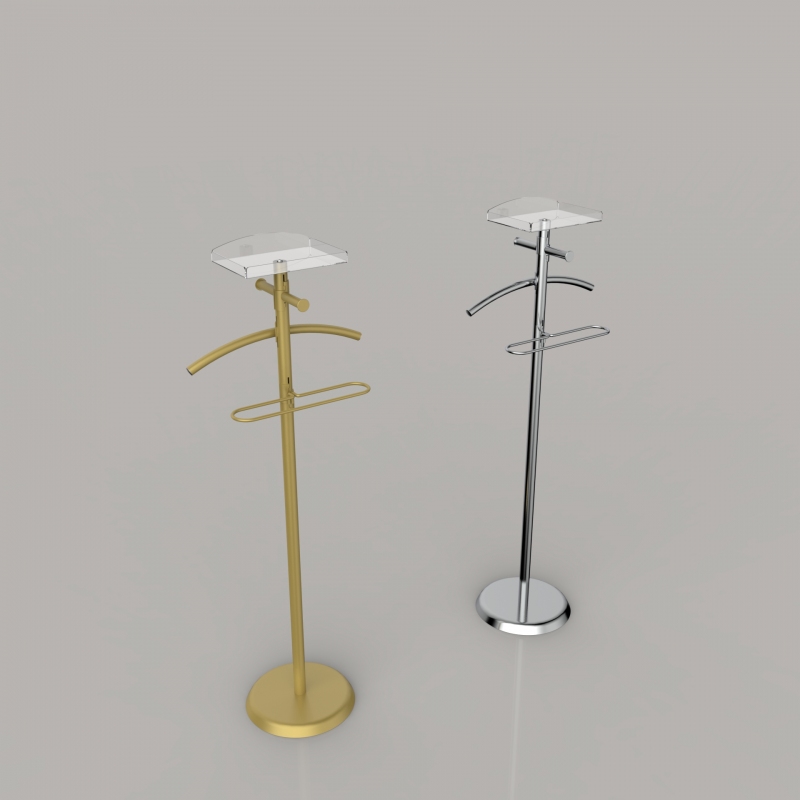 Servomuto, indossatore da camera, con vaschetta in plexiglass, porta-giacca, porta-pantalone e due ganci corti.